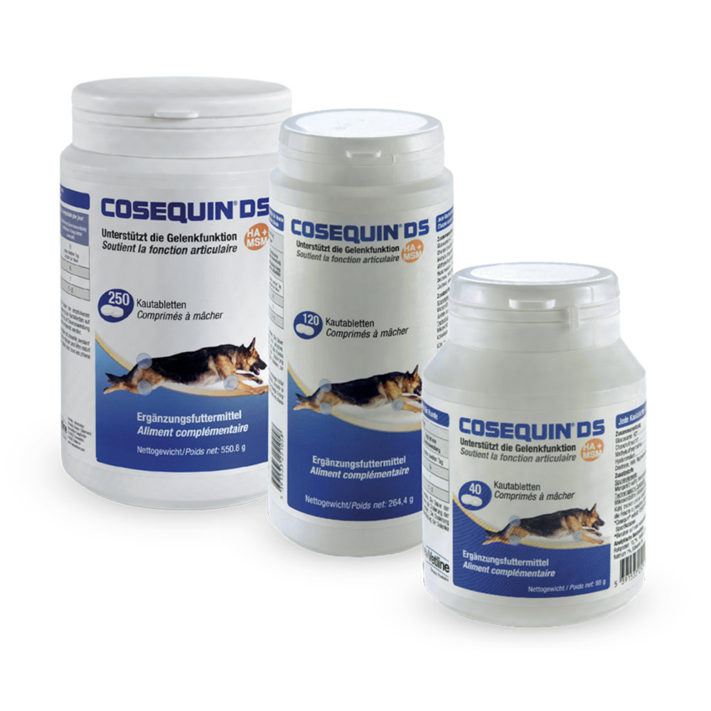 Für Hunde gibt es Cosequin als Kautablette mit Hühnchen-Schweinefleisch-Hefegeschmack, die auch gern als Leckerli angenommen wird oder zur Gabe über das Futter.