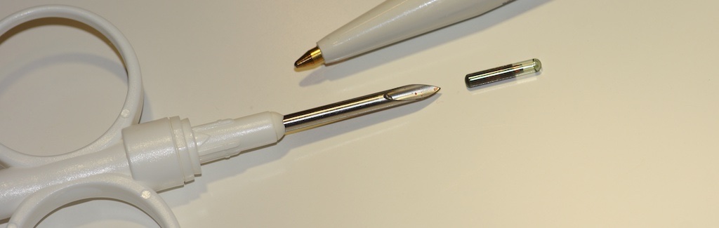 Mittel der Wahl ist die Tierkennzeichnung per Microchip. Dabei wird ein reiskorngroßer Mikrochip unter die Haut des Tieres implantiert. Der Vorgang ist mit einer Impfung vergleichbar und mehr oder minder schmerzlos. Ich bin immer wieder überrascht, wie tapfer unsere Patienten diese Prozedur über sich ergehn lassen.